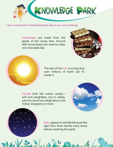 11Let us read some interesting facts about our surroundings.Chocolates are made from the seeds of the cocoa tree. Around 400 cocoa beans are used to make one chocolate bar.Clouds look like cotton candy%u2014 soft and weightless, but in reality, just one cloud can weigh about one million kilograms or more.The size of the sun is so big that over millions of Earth can fit inside it.Stars appear to twinkle because the light from them bends many times before reaching the earth.
