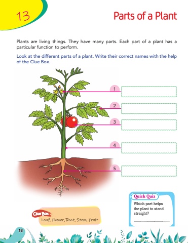 181234513Parts of a PlantPlants are living things. They have many parts. Each part of a plant has a particular function to perform. Look at the different parts of a plant. Write their correct names with the help of the Clue Box.Leaf, Flower, Root, Stem, FruitClue BoxWhich part helps the plant to stand straight?....................................