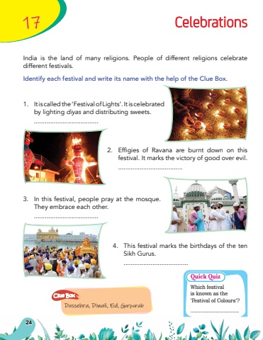 2417CelebrationsIndia is the land of many religions. People of different religions celebrate different festivals. Identify each festival and write its name with the help of the Clue Box.1.It is called the %u2018Festival of Lights%u2019. It is celebrated by lighting diyas and distributing sweets.....................................2.Effigies of Ravana are burnt down on this festival. It marks the victory of good over evil.....................................3.In this festival, people pray at the mosque. They embrace each other.....................................4.This festival marks the birthdays of the ten Sikh Gurus.....................................Dussehra, Diwali, Eid, GurpurabClue BoxWhich festival is known as the %u2018Festival of Colours%u2019?...................................