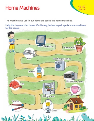 33Home Machines25The machines we use in our home are called the home machines.Help the boy reach his house. On his way, he has to pick up six home machines for his house.TelevisionFlower PotWashing MachineMicrowave OvenCupIronBottleCapRefrigeratorMixerPencils