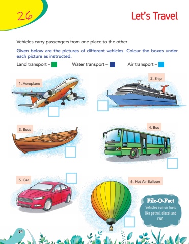 3426Let%u2019s TravelVehicles carry passengers from one place to the other.Given below are the pictures of different vehicles. Colour the boxes under each picture as instructed.Land transport %u2013 Water transport %u2013 Air transport %u2013 Vehicles run on fuels like petrol, diesel and CNG.File-O-Fact1. Aeroplane3. Boat5. Car6. Hot Air Balloon4. Bus2. Ship