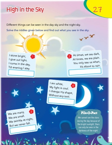 35Different things can be seen in the day sky and the night sky.Solve the riddles given below and find out what you see in the sky.At times, we are dark,At times, we are plain.You only see us when,It%u2019s about to rain.I am white,My light is cool.I change my shape,Without any tool.We are many,We are small.We twinkle at night,But we never fall.I shine bright,I give out light.I come in the day,Till evening I stay.High in the SkyWe cannot see the stars during the day because of the bright sunlight. Stars can only be seen in the darkness of the night.File-O-Fact134227