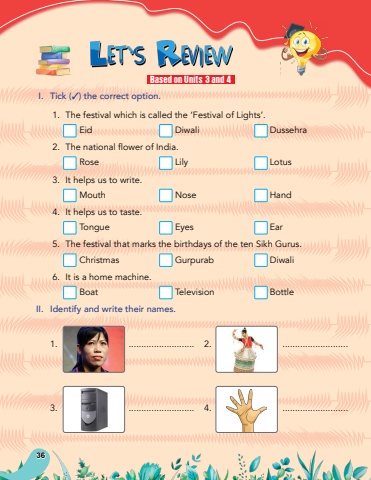 36I.Tick (3) the correct option.1.The festival which is called the %u2018Festival of Lights%u2019.EidDiwaliDussehra2.The national flower of India.RoseLilyLotus3.It helps us to write.MouthNoseHand4.It helps us to taste.TongueEyesEar5.The festival that marks the birthdays of the ten Sikh Gurus.ChristmasGurpurabDiwali6.It is a home machine.BoatTelevisionBottleII.Identify and write their names.1...........................2...........................3...........................4...........................Based on Units 3 and 4