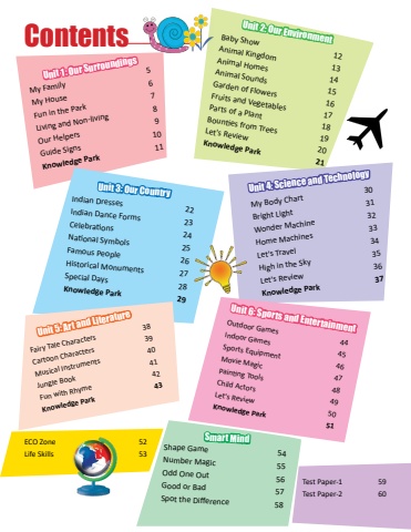 My Family5My House6FuninthePark%u00097Living and Non-living8Our Helpers9Guide Signs10Knowledge Park11Unit 1: Our SurroundingsBaby Show12Animal Kingdom13Animal Homes14Animal Sounds15Garden of Flowers16Fruits and Vegetables17PartsofaPlant%u000918BountiesfromTrees%u000919Let's Review20Knowledge Park21Unit 2: Our EnvironmentIndian Dresses22Indian Dance Forms23Celebrations%u0009Na24tionalSymbols%u000925FamousPeople%u0009His26torical Monuments27Special Days28Knowledge Park29Unit 3: Our CountryFairy Tale Characters38Cartoon Characters39Musical Instruments40Jungle Book41Fun with Rhyme42Knowledge Park43Unit 5: Art and LiteratureOutdoor Games44Indoor Games45Sports Equipment46Movie Magic47PaintingTools%u000948Child Actors49Let's Review50Knowledge Park51Unit 6: Sports and EntertainmentUnit 6: Sports and EntertainmentMy Body Chart30Bright Light31Wonder Machine32Home Machines33Let's Travel34High in the Sky35Let's Review36Knowledge Park37Unit 4: Science and TechnologyShape Game54Number Magic55Odd One Out56Good or Bad57SpottheDifference%u000958ECO Zone52Smart MindLife Skills53TestPaper-1%u0009 59TestPaper-2%u0009 60Contents