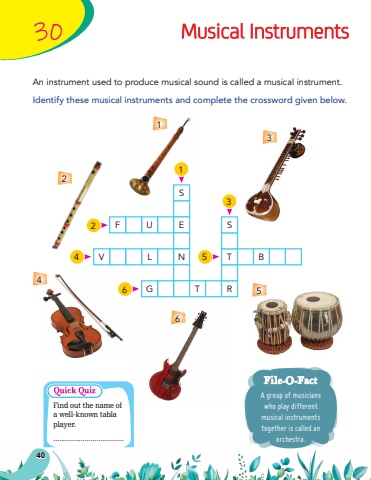 4030Musical InstrumentsA group of musicians who play different musical instruments together is called an orchestra.File-O-FactAn instrument used to produce musical sound is called a musical instrument.Identify these musical instruments and complete the crossword given below.SFUEVLNGTRTBS135642312456Find out the name of a well-known tabla player.....................................