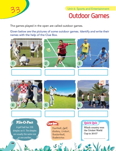 4433The games played in the open are called outdoor games.Given below are the pictures of some outdoor games. Identify and write their names with the help of the Clue Box.A golf ball has 336 dimples on it. The dimples are usually the same size as one another.File-O-FactFootball, Golf, Hockey, Cricket, Basketball, BadmintonClue BoxOutdoor GamesUnit 6: Sports and Entertainment142536Which country won the Cricket World Cup in 2015?...................................
