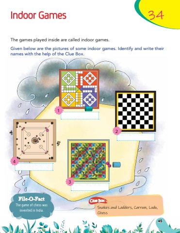 45The game of chess was invented in India.File-O-FactSnakes and Ladders, Carrom, Ludo, ChessClue BoxIndoor Games34The games played inside are called indoor games.Given below are the pictures of some indoor games. Identify and write their names with the help of the Clue Box.1432