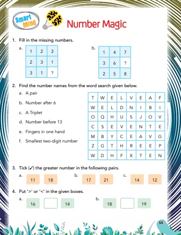 SmartMind55Number Magic1.Fill in the missing numbers.a.1 2 32 3 13 1 ?b.1 4 73 6 ?2 5 82.Find the number names from the word search given below.a.A pairb.Number after 6c.A Tripletd.Number before 13e.Fingers in one handf.Smallest two-digit number3.Tick (3) the greater number in the following pairs.a.b.c.4.Put %u2018>%u2019 or %u2018<%u2019 in the given boxes.a.b.T W E L V E A FW E L D N I B IO Q H U S J O VC S E V E N T EM B Y C E A V GZ G T H R E E PW D H F X T E N11161818171414192112