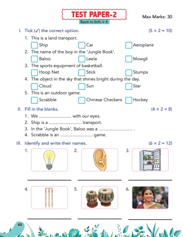 60Based on Units 4-6I.Tick (3) the correct option.(5 %u00d7 2 = 10)1.This is a land transport.ShipCarAeroplane2.The name of the boy in the %u2018Jungle Book%u2019.BalooLeelaMowgli3.The sports equipment of basketball.Hoop NetStickStumps4.The object in the sky that shines bright during the day.CloudSunStar5.This is an outdoor game.ScrabbleChinese CheckersHockeyII.Fill in the blanks.(4 %u00d7 2 = 8)1.We .......................... with our eyes.2.Ship is a .......................... transport.3.In the %u2018Jungle Book%u2019, Baloo was a ........................... .4.Scrabble is an .......................... game.III.Identify and write their names.(6 %u00d7 2 = 12)1.2.3.4.5.6.TEST PAPER-2Max Marks: 30