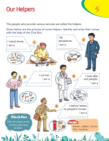 9Our Helpers5Pilots use compass to find directions while flying aeroplane.File-O-FactBarber, Cobbler, Doctor, Pilot, PostmanClue BoxThe people who provide various services are called the helpers.Given below are the pictures of some helpers. Identify and write their names with the help of the Clue Box.I mend shoes.I am a ..........................I fly aeroplanes.I am a ..........................I cut hair.I am a ..........................I look after sick people.I am a ..........................I deliver letters to people%u2019s houses.I am a ..........................12453