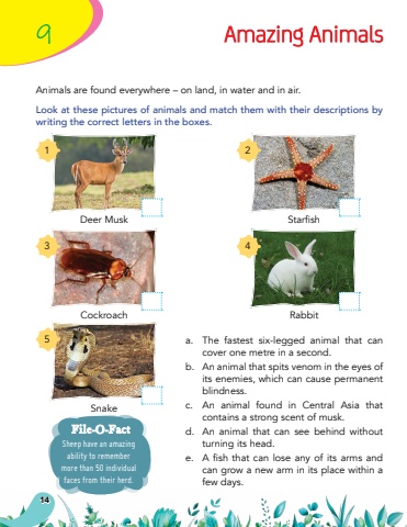 14a.The fastest six-legged animal that can cover one metre in a second.b.An animal that spits venom in the eyes of its enemies, which can cause permanent blindness.c.An animal found in Central Asia that contains a strong scent of musk.d.An animal that can see behind without turning its head.e.A fish that can lose any of its arms and can grow a new arm in its place within a few days.Animals are found everywhere %u2013 on land, in water and in air.Look at these pictures of animals and match them with their descriptions by writing the correct letters in the boxes.9Amazing AnimalsSheep have an amazing ability to remember more than 50 individual faces from their herd.File-O-FactDeer MuskStarfishCockroachSnakeRabbit24135