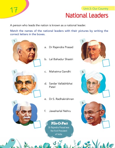 2413524617A person who leads the nation is known as a national leader.Match the names of the national leaders with their pictures by writing the correct letters in the boxes.Dr Rajendra Prasad was the first President of India.File-O-Facta.Dr Rajendra Prasadb.Lal Bahadur Shastric.Mahatma Gandhid.Sardar Vallabhbhai Patele.Dr S. Radhakrishnanf.Jawaharlal NehruNational LeadersUnit 3: Our Country