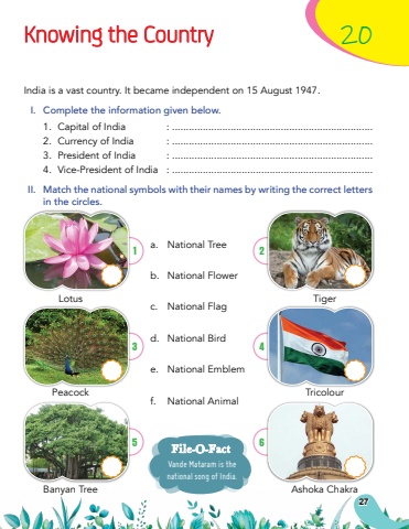 27246135India is a vast country. It became independent on 15 August 1947.I.Complete the information given below.1.Capital of India: ........................................................................2.Currency of India: ........................................................................3.President of India: ........................................................................4.Vice-President of India: ........................................................................II.Match the national symbols with their names by writing the correct letters in the circles.Knowing the Country20a.National Treeb.National Flowerc.National Flagd.National Birde.National Emblemf.National AnimalVande Mataram is the national song of India.File-O-FactTigerLotusTricolourPeacockAshoka ChakraBanyan Tree