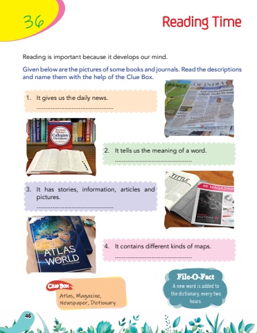 4636Reading TimeReading is important because it develops our mind.Given below are the pictures of some books and journals. Read the descriptions and name them with the help of the Clue Box.Atlas, Magazine, Newspaper, DictionaryClue Box1.It gives us the daily news.............................................3.It has stories, information, articles and pictures.............................................2.It tells us the meaning of a word.............................................4.It contains different kinds of maps.............................................A new word is added to the dictionary, every two hours.File-O-Fact