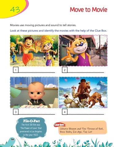 54Chhota Bheem and The Throne of Bali, Boss Baby, Ice Age, Top Cat43Move to MovieMovies use moving pictures and sound to tell stories.Look at these pictures and identify the movies with the help of the Clue Box.The first 3D film was Clue Box%u2018The Power of Love%u2019 that premiered in Los Angeles in the year 1922.File-O-Fact1324