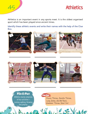 5645Athletics is an important event in any sports meet. It is the oldest organised sport which has been played since ancient times.Identify these athletic events and write their names with the help of the Clue Box.Discus Throw, Javelin Throw, Long Jump, Hurdle Race, Hammer Throw, Shot PutClue BoxAthleticsAthletics mainly comprises of four activities %u2013 running, walking, throwing and jumping.File-O-Fact142536