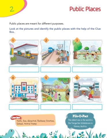 6Public places are meant for different purposes.Look at the pictures and identify the public places with the help of the Clue Box.2Public PlacesClue BoxPark, Zoo, Hospital, Railway Station, School, Petrol PumpThe oldest zoo in the world is the Tiergarten Sch%u00f6nbrunn in Vienna, Austria.File-O-Fact142536