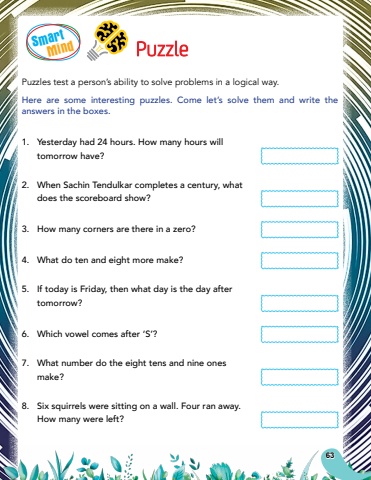 SmartMind63PuzzlePuzzles test a person%u2019s ability to solve problems in a logical way.Here are some interesting puzzles. Come let%u2019s solve them and write the answers in the boxes.1.Yesterday had 24 hours. How many hours will tomorrow have?2.When Sachin Tendulkar completes a century, what does the scoreboard show?3.How many corners are there in a zero?4.What do ten and eight more make?5.If today is Friday, then what day is the day after tomorrow?6.Which vowel comes after %u2018S%u2019?7.What number do the eight tens and nine ones make?8.Six squirrels were sitting on a wall. Four ran away. How many were left?