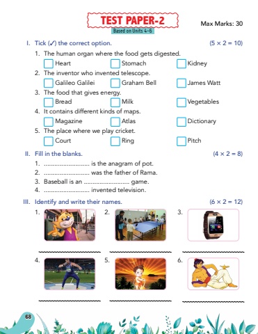 68Based on Units 4-6I.Tick (3) the correct option.(5 %u00d7 2 = 10)1.The human organ where the food gets digested.HeartStomachKidney2.The inventor who invented telescope.Galileo GalileiGraham BellJames Watt3.The food that gives energy.BreadMilkVegetables4.It contains different kinds of maps.MagazineAtlasDictionary5.The place where we play cricket.CourtRingPitchII.Fill in the blanks.(4 %u00d7 2 = 8)1........................... is the anagram of pot.2........................... was the father of Rama.3.Baseball is an .......................... game.4........................... invented television.III.Identify and write their names.(6 %u00d7 2 = 12)1.2.3.4.5.6.TEST PAPER-2Max Marks: 30
