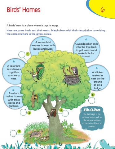A birds%u2019 nest is a place where it lays its eggs.Here are some birds and their nests. Match them with their description by writing the correct letters in the given circles.12543Birds%u2019 Homes6A tailorbird sews leaves together to make a nest.A weaverbird weaves its nest with leaves and twigs.A woodpecker drills into the tree bark to get insects and make hole for its nest.A killdeer makes its nest on the ground or on a ledge.A vulture makes its nest with grass leaves and feathers.b.c.d.e.a.The bald eagle is the national bird as well as the national emblem of the United States of America.File-O-Fact11