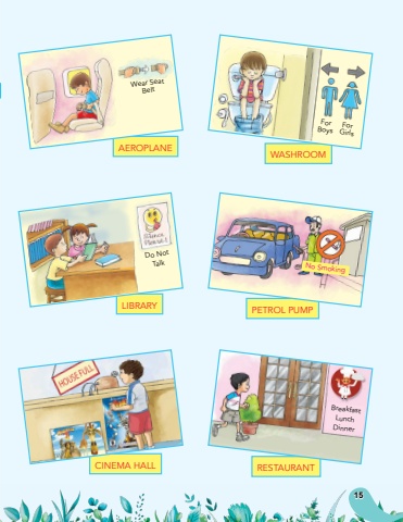 AEROPLANEWASHROOMPETROL PUMPCINEMA HALLLIBRARYRESTAURANTWear Seat BeltDo NotTalkNo SmokingBreakfastLunchDinnerFor BoysFor Girls15