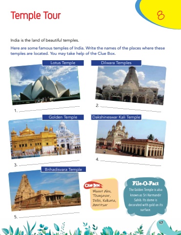 Temple Tour8India is the land of beautiful temples.Here are some famous temples of India. Write the names of the places where these temples are located. You may take help of the Clue Box.1. .....................................................3. .....................................................5. .....................................................2. .....................................................4. .....................................................Lotus TempleDilwara TemplesBrihadisvara TempleGolden TempleDakshineswar Kali TempleMount Abu, Thanjavur, Delhi, Kolkata, AmritsarClue BoxThe Golden Temple is also known as Sri Harmandir Sahib. Its dome is decorated with gold on its surface.File-O-Fact17