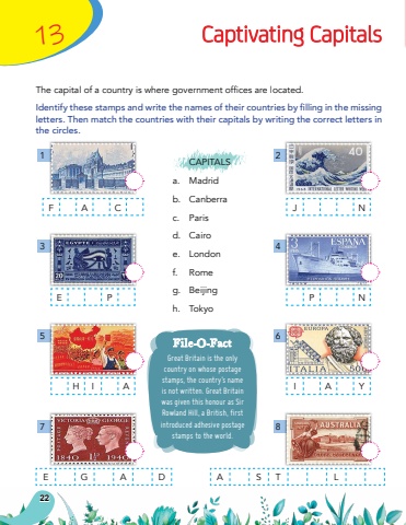 78The capital of a country is where government offices are located.Identify these stamps and write the names of their countries by filling in the missing letters. Then match the countries with their capitals by writing the correct letters in the circles.13Captivating CapitalsE G A DA S T LGreat Britain is the only country on whose postage stamps, the country%u2019s name is not written. Great Britain was given this honour as Sir Rowland Hill, a British, first introduced adhesive postage stamps to the world.File-O-FactCAPITALSa.Madridb.Canberrac.Parisd.Cairoe.Londonf.Romeg.Beijingh.Tokyo 135246F A CJ NE PP NH I AI A Y22