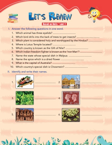 I.Answer the following questions in one word.1.Which animal has three eyelids? ................................2.Which bird drills into the bark of trees to get insects? ................................3.Which plant is considered holy and worshipped by the Hindus? ...................4.Where is Lotus Temple located? ................................5.Which country is known as the Gift of Nile? ................................6.Which Indian freedom fighter is known as the %u2018Iron Man%u2019? ...............................7.Name the state whose special dish in Malpua. ................................8.Name the spice which is a dried flower. ................................9.What is the capital of Australia? ................................10.Which country%u2019s special dish is Chowmein? ................................II.Identify and write their names.1..............................2..............................3..............................4..............................5..............................6..............................Based on Units 1 and 223