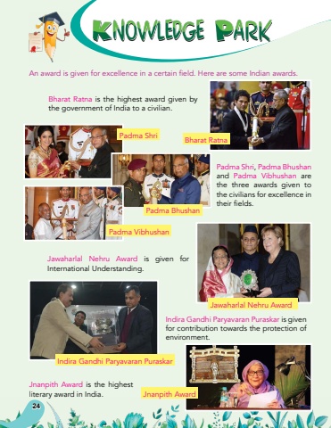 Bharat Ratna is the highest award given by the government of India to a civilian.An award is given for excellence in a certain field. Here are some Indian awards.Padma Shri, Padma Bhushan and Padma Vibhushan are the three awards given to the civilians for excellence in their fields. Jawaharlal Nehru Award is given for International Understanding.Bharat RatnaJnanpith Award is the highest literary award in India.Indira Gandhi Paryavaran Puraskar is given for contribution towards the protection of environment.Padma ShriPadma BhushanPadma VibhushanJawaharlal Nehru AwardIndira Gandhi Paryavaran PuraskarJnanpith Award24