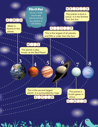Water is found on this planet.This planet is also known as the Red Planet.This is the largest of all planets and fifth in order from the Sun.This planet is blue in colour. It is the farthest ERHfrom the Sun.MS345678JIRUASSTNNETEThis is the second largest planet. It is surrounded by rings.This planet is bluish-green in colour.The Sun is 15,000 crore km away from the earth and has a diameter of 1,391,940 km.File-O-Fact27