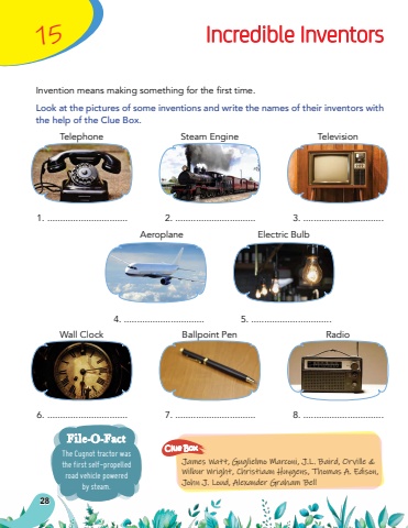 Invention means making something for the first time.Look at the pictures of some inventions and write the names of their inventors with the help of the Clue Box.1. ...............................6. ...............................2. ...............................7. ...............................4. ............................... 5. ...............................3. ...............................8. ...............................15Incredible InventorsThe Cugnot tractor was the first self-propelled road vehicle powered by steam.File-O-FactTelephoneWall ClockSteam EngineBallpoint PenTelevisionRadioAeroplane Electric BulbJames Watt, Guglielmo Marconi, J.L. Baird, Orville & Wilbur Wright, Christiaan Huygens, Thomas A. Edison, John J. Loud, Alexander Graham BellClue Box28