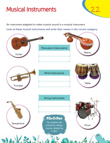 22An instrument adapted to make musical sound is a musical instrument.Look at these musical instruments and write their names in the correct category.GuitarDrumSaxophoneTrumpetVeenaMusical InstrumentsTablaWind InstrumentsString InstrumentsThe saxophone was invented by a Belgian musician, Adolphe Sax in 1841.File-O-FactPercussion Instruments37