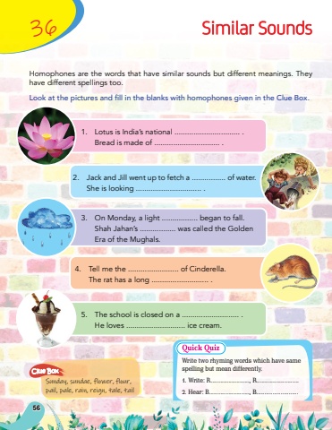 Similar SoundsHomophones are the words that have similar sounds but different meanings. They have different spellings too.Look at the pictures and fill in the blanks with homophones given in the Clue Box.1.Lotus is India%u2019s national ............................... .Bread is made of ............................... .2.Jack and Jill went up to fetch a ................ of water.She is looking ............................... .3.On Monday, a light ................. began to fall.Shah Jahan%u2019s ................. was called the GoldenEra of the Mughals.4.Tell me the ........................ of Cinderella.The rat has a long ........................... .5.The school is closed on a ........................... .He loves ............................ ice cream.Sunday, sundae, flower, flour, pail, pale, rain, reign, tale, tailClue Box36Write two rhyming words which have same spelling but mean differently.1. Write: R........................, R..........................2. Hear: B........................., B..........................56