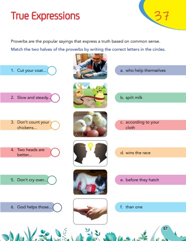 True Expressions371.Cut your coat...a.who help themselves2.Slow and steady...b.spilt milk3.Don%u2019t count your c.according to your chickens...cloth4.Two heads are d.wins the racebetter...5.Don%u2019t cry over...e.before they hatch6.God helps those...f.than oneProverbs are the popular sayings that express a truth based on common sense.Match the two halves of the proverbs by writing the correct letters in the circles.57