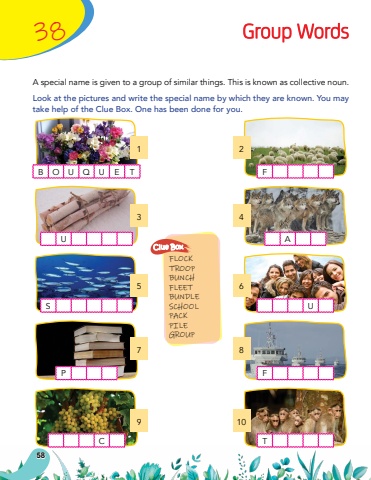 38Group WordsA special name is given to a group of similar things. This is known as collective noun.Look at the pictures and write the special name by which they are known. You may take help of the Clue Box. One has been done for you.B O U Q U E TF12UA34SU56PF78CT910FLOCKTROOPBUNCHFLEETBUNDLESCHOOLPACKPILEGROUPClue Box58