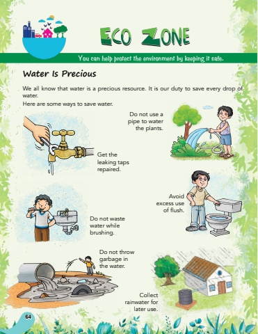 You can help protect the environment by keeping it safe.Do not throw garbage in the water.Collect rainwater for later use.Do not use a pipe to water the plants.Avoid excess use of flush.Get the leaking taps repaired.Do not waste water while brushing.Water Is PreciousWe all know that water is a precious resource. It is our duty to save every drop of water.Here are some ways to save water.64