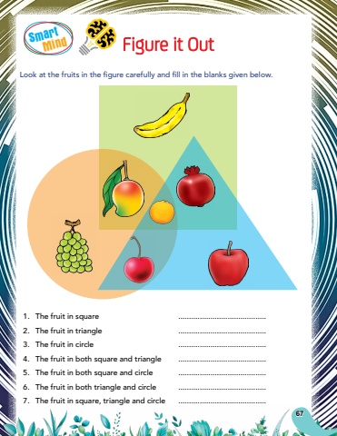 SmartMindFigure it OutLook at the fruits in the figure carefully and fill in the blanks given below.1.The fruit in square .........................................2.The fruit in triangle.........................................3.The fruit in circle.........................................4.The fruit in both square and triangle.........................................5.The fruit in both square and circle.........................................6.The fruit in both triangle and circle.........................................7.The fruit in square, triangle and circle.........................................67