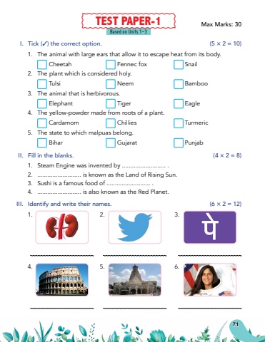 Based on Units 1-3I.Tick (3) the correct option.(5 %u00d7 2 = 10)1.The animal with large ears that allow it to escape heat from its body.CheetahFennec foxSnail2.The plant which is considered holy.TulsiNeemBamboo3.The animal that is herbivorous.ElephantTigerEagle4.The yellow-powder made from roots of a plant.CardamomChilliesTurmeric5.The state to which malpuas belong.BiharGujaratPunjabII.Fill in the blanks.(4 %u00d7 2 = 8)1.Steam Engine was invented by .......................... .2........................... is known as the Land of Rising Sun.3.Sushi is a famous food of .......................... .4........................... is also known as the Red Planet.III.Identify and write their names.(6 %u00d7 2 = 12)1.2.3.4.5.6.TEST PAPER-1Max Marks: 3071