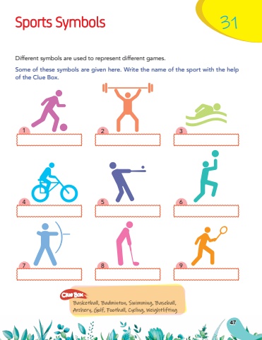 147258369Sports Symbols31Different symbols are used to represent different games.Some of these symbols are given here. Write the name of the sport with the help of the Clue Box.Basketball, Badminton, Swimming, Baseball, Archery, Golf, Football, Cycling, WeightliftingClue Box47