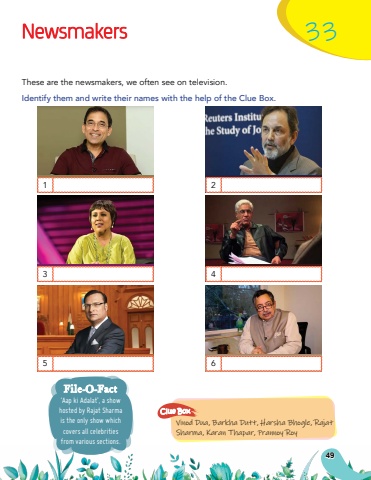 NewsmakersThese are the newsmakers, we often see on television.Identify them and write their names with the help of the Clue Box.Vinod Dua, Barkha Dutt, Harsha Bhogle, Rajat Sharma, Karan Thapar, Prannoy RoyClue Box33135246%u2018Aap ki Adalat%u2019, a show hosted by Rajat Sharma is the only show which covers all celebrities from various sections.File-O-Fact49