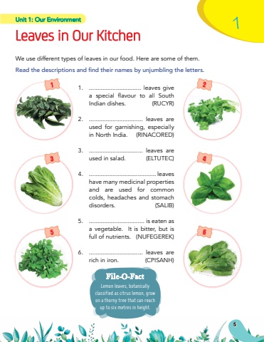 1Unit 1: Our EnvironmentLeaves in Our KitchenWe use different types of leaves in our food. Here are some of them.Read the descriptions and find their names by unjumbling the letters.Lemon leaves, botanically classified as citrus lemon, grow on a thorny tree that can reach up to six metres in height.File-O-Fact1................................ leaves give a special flavour to all South Indian dishes.(RUCYR)2................................. leaves are used for garnishing, especially in North India.(RINACORED)3................................. leaves are used in salad.(ELTUTEC)4......................................... leaves have many medicinal properties and are used for common colds, headaches and stomach disorders.(SALIB)5.................................. is eaten as a vegetable. It is bitter, but is full of nutrients.(NUFEGEREK)6................................. leaves are rich in iron.(CPISANH)1352465