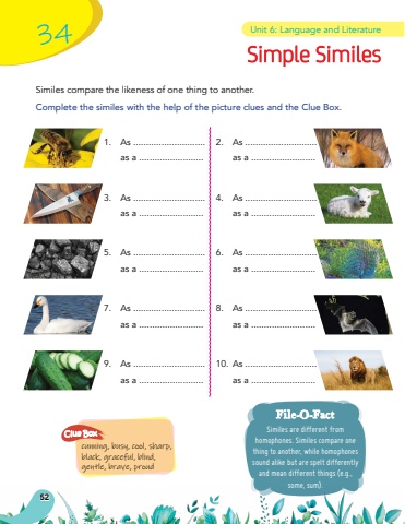 Simple SimilesSimiles compare the likeness of one thing to another.Complete the similes with the help of the picture clues and the Clue Box.Similes are different from homophones. Similes compare one thing to another, while homophones sound alike but are spelt differently and mean different things (e.g., some, sum).File-O-Factcunning, busy, cool, sharp, black, graceful, blind, gentle, brave, proudClue Box1.As ............................ as a ......................... 2.As ............................ as a ......................... 3.As ............................ as a ......................... 4.As ............................ as a ......................... 5.As ............................ as a ......................... 6.As ............................ as a ......................... 7.As ............................ as a ......................... 8.As ............................ as a ......................... 9.As ............................ as a ......................... 10.As ............................ as a ......................... 34Unit 6: Language and Literature52