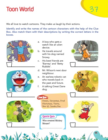 a.A boy who gets a watch like an alien device.b.He travels around with his dog named Snowy.c.His best friends are %u2018Barney%u2019 and %u2018Betty Rubble%u2019.d.Mr. Wilson%u2019s next door neighbour.e.An earless robotic cat who travels back in the past and future.f.A talking Great Dane dog.Toon WorldWe all love to watch cartoons. They make us laugh by their actions. Identify and write the names of the cartoon characters with the help of the Clue Box. Also match them with their descriptions by writing the correct letters in the boxes.Dennis, Doraemon, Fred Flintstone, Tintin, Ben 10, Scooby-DooClue Box37135246Who created Mickey Mouse?...................................55