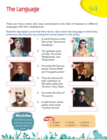 1.A world-famous writer. She wrote %u2018Sense and Sensibility%u2019.2.The greatest poet of India. He wrote %u2018Meghaduta%u2019 and %u2018Shakuntala%u2019.3.He wrote the famous books %u2018Anand Math%u2019 and %u2018Durgeshnandini%u2019.4.They are famous for their collection of folk tales called the %u2018Grimms%u2019 Fairy Tales%u2019.5.He wrote the story of %u2018Pinocchio%u2019.6.A well-known Indian author who wrote %u2018Tumhari Amrita%u2019.The LanguageClue BoxThere are many writers who have contributed to the field of literature in different languages with their masterpieces.Read the description and write their names. Also match the language in which they write from the Clue Box by writing the correct letters in the circles.391135246Jules Verne is a famous writer who wrote many books for children in French.File-O-Facta. Bengalic. Punjabie. Germanb. Italiand. Sanskritf. English57