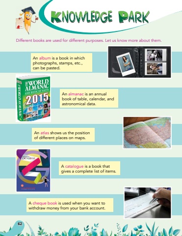 Different books are used for different purposes. Let us know more about them.An album is a book in which photographs, stamps, etc., can be pasted.An almanac is an annual book of table, calendar, and astronomical data.An atlas shows us the position of different places on maps.A catalogue is a book that gives a complete list of items.A chequebook is used when you want to withdraw money from your bank account.62