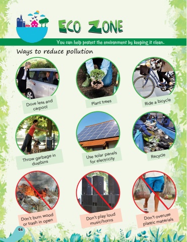 You can help protect the environment by keeping it clean. Drive less and carpoolThrow garbage in dustbinsDon%u2019t burn wood or trash in openUse solar panels for electricityDon%u2019t play loud music/hornsDon%u2019t overuse plastic materialsRecyclePlant treesRide a bicycleWays to reduce pollution64