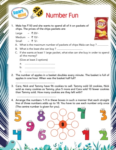 SmartMind1.Mala has ` 50 and she wants to spend all of it on packets of chips. The prices of the chips packets are:Large%u2013` 20/-Medium%u2013` 10/-Small%u2013` 5/-A.What is the maximum number of packets of chips Mala can buy ? ...............B.What is the least she can buy ? ...................................C.If she wants at least 1 large packet, what else can she buy in order to spend all the money? (Give at least 3 options)a..........................................b..........................................c..........................................2.The number of apples in a basket doubles every minute. The basket is full of apples in one hour. When was the basket half full?.....................................................3.Cara, Nick and Tammy have 96 cookies to sell. Tammy sold 32 cookies, Nick sold as many cookies as Tammy, plus 5 more and Cara sold 10 fewer cookies than Tammy sold. How many cookies are they left with?.....................................................4.Arrange the numbers 1%u20139 in these boxes in such a manner that each straight line of three numbers adds up to 18. You have to use each number only once (The centre number is given for you).Number Fun966