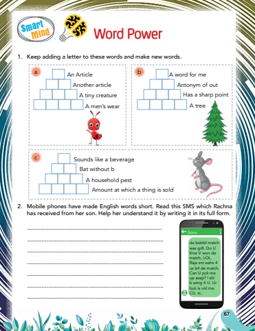 SmartMindWord Power1.Keep adding a letter to these words and make new words.2.Mobile phones have made English words short. Read this SMS which Rachna has received from her son. Help her understand it by writing it in its full form.An ArticleSounds like a beverageA word for meAnother articleBat without bAntonym of outA tiny creatureA household pestHas a sharp pointA men%u2019s wearAmount at which a thing is soldA tree...........................................................................................................................................................................................................................................................................................................................................................................................................................................................................................................................................................................................................acbSonude bsktbl match was gr8. Do U Knw V won de match, LOL. Raja snt wshs 4 us b4 de match. Can U pck me up asap? I shl b wtng 4 U. Ur buk is vid me. CU. tc.67