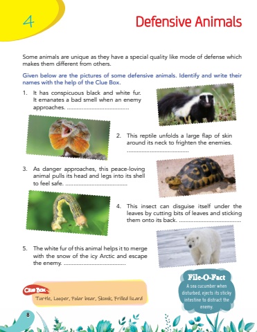 4Some animals are unique as they have a special quality like mode of defense which makes them different from others.Given below are the pictures of some defensive animals. Identify and write their names with the help of the Clue Box.1.It has conspicuous black and white fur. It emanates a bad smell when an enemy approaches. ......................................2.This reptile unfolds a large flap of skin around its neck to frighten the enemies. ......................................3.As danger approaches, this peace-loving animal pulls its head and legs into its shell to feel safe. ......................................4.This insect can disguise itself under the leaves by cutting bits of leaves and sticking them onto its back. ......................................5.The white fur of this animal helps it to merge with the snow of the icy Arctic and escape the enemy. ......................................Turtle, Looper, Polar bear, Skunk, Frilled lizardClue BoxDefensive AnimalsA sea cucumber when disturbed, ejects its sticky intestine to distract the enemy.File-O-Fact8