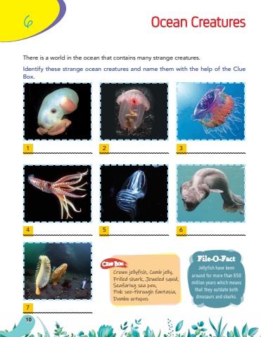 614736Ocean CreaturesThere is a world in the ocean that contains many strange creatures.Identify these strange ocean creatures and name them with the help of the Clue Box.25Jellyfish have been around for more than 650 million years which means that they outdate both dinosaurs and sharks.File-O-FactCrown jellyfish, Comb jelly, Frilled shark, Jeweled squid, Seafaring sea pen, Pink see-through fantasia, Dumbo octopusClue Box10